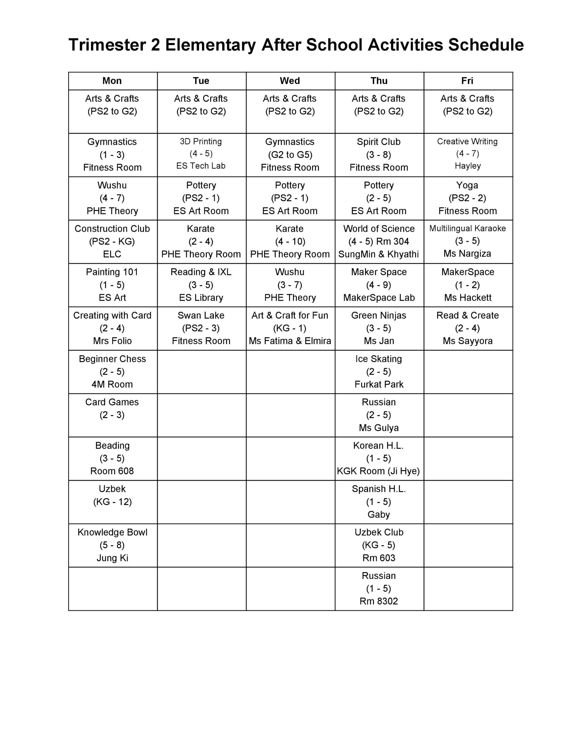 Tashkent International School offers elementary students a wide range of after-school activities throughout the school year. The activities are divided into three terms, or trimesters – fall, winter and spring. Some activities, such as student councils will run for the whole year, whilst other activities are only offered for one or two trimesters.